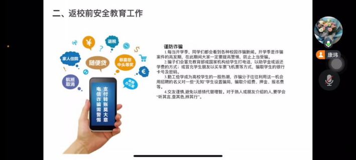 会议开始,首先由康玮老师对开学时间及安排进行说明,解答同学们对开学工作安排的疑惑。然后对同学们进行了返校安全教育,提高了同学们特别是新生的人身安全和财产安全意识。