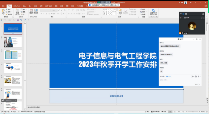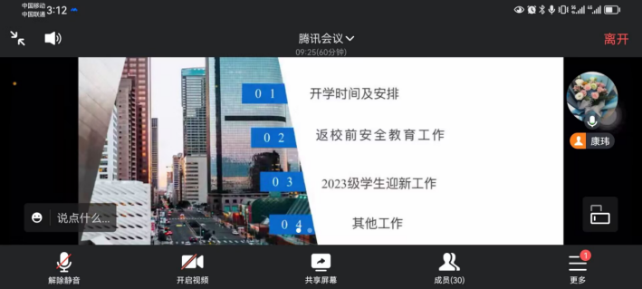 2023年8月23日15时,bevictor伟德官网召开了2023年秋季研究生开学主题班会,通过线上会议的方式,分别在研究生新生班级和老生班级召开。两场会议由公司研究生会主席尚玉豪同学主持,康玮辅导员主讲,对秋季开学的工作安排和返校注意事项进行详细说明,为顺利开展返校工作做好充分准备。