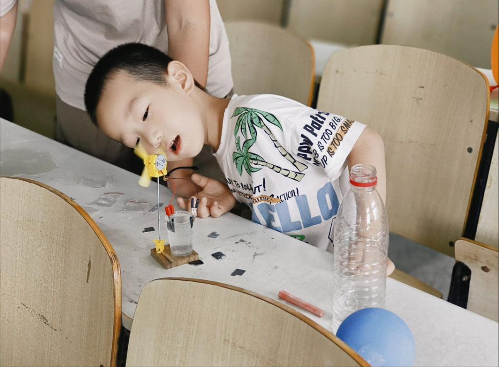 7月8日下午2时许,“愿益”社会实践团队带领韦德官方网站周边社区中小员工来到韦德官方网站12教1楼,带领他们亲身参与人工智能小实验中,感悟科技的奥妙。在科技展里,“愿益”团队本科生实践队选择以科普小游戏为切入点,向中小员工展示电子信息公司员工的课程设计作品,帮助他们了解科技文化知识,并激发他们对科学技术的兴趣。除了理论知识外,团队开展了科技小课堂活动——“盐水发电”、“柠檬电池”、“动力气流”等诸多模块,并配有专门的志愿者进行演示,向他们讲解其中的实验原理,然后在志愿者的监护下,让小朋友也可以尝试这样的小实验。让孩子们亲自参与一些简单的应用实验,从而增强孩子们的动手能力,将所学知识与实际应用联系起来。