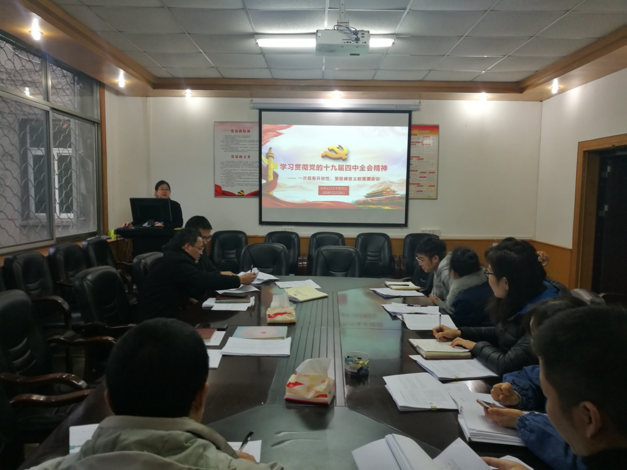 2019年11月25日下午电信公司分党委分别召开理论学习中心组学习和党支部书记会议,由分党委书记宣讲四中全会精神。会后各党支部组织开展11月份第二次支部主题党日活动,集中学习贯彻党的十九届四中全会精神。28日分党委书记刘逸组织全体教职工和员工党员、发展对象学习贯彻党的十九届四中全会精神。在学习贯彻党的十九届四中全会精神会上,通过“一图读懂四中全会”熟悉了党的十九届四中全会的会议内容、我国国家制度和国家治理体系具有的显著优势、坚持和完善中国特色社会主义制度推进国家治理体系和治理能力现代化的总体目标和工作要求;通过观看微视频“字里行间看《决定》”,对《决定》中的3大板块、15个部分、200多项重大举措、222个高频关键词“制度”有了更全面的了解;通过学习“上善若水,水滴石穿——学习贯彻党的十九届四中全会精神等内容”,对党的十九届四中全会精神有了更深入的理解和体会。刘书记结合宣讲党的十九届四中全会精神,讲了一次形势与政策课,上了一堂生动的主题教育党课。