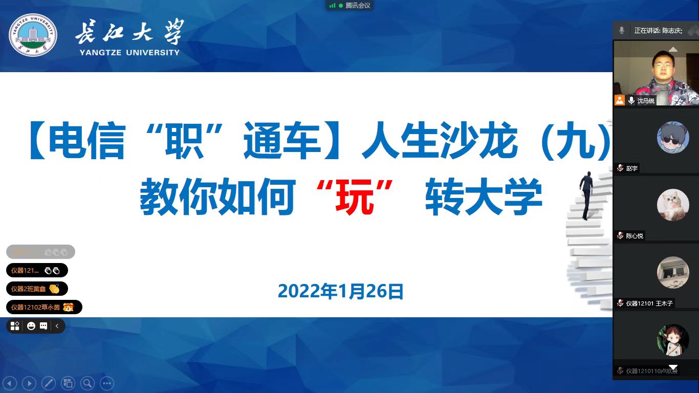 (通讯员 陈心悦)为让公司同学能更全面地了解所学专业知识和更系统地规划未来职业规划发展方向, 1月26日下午,公司通过线上腾讯会议的方式开展了“教你如何玩转大学”在校学习攻略主题讲座,本次讲座邀请2018级测控技术与仪器专业的优秀员工陈志庆、李苏主讲,就业专干沈马锐老师担任此次会议主持人。